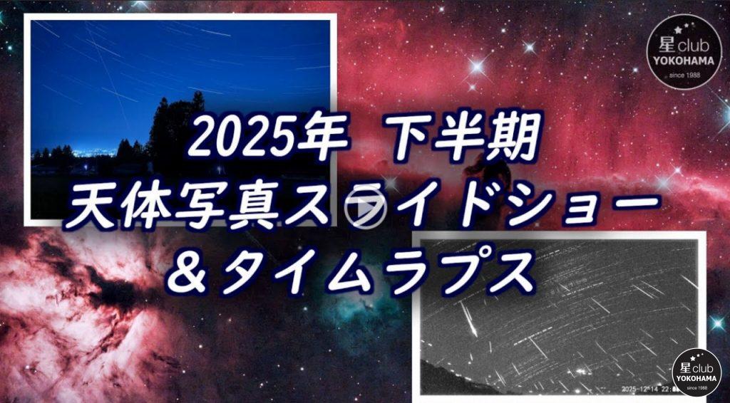 投稿日: 2026年1月2日2026年1月5日2025年下半期「天体写真スライドショー&タイムラプス」が公開されました2025年下半期にクラブ会員が撮影した、観測報告の写真です。日々良い天体写真の撮影に努力しております、素晴らしい星空の美しさをお届けできれば幸いです。 撮影者一同お友達にシェアしていただけると嬉しいです。