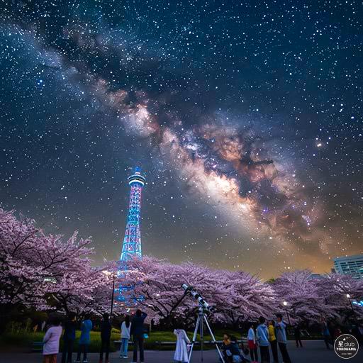 (日本語)横浜マリンタワーがそびえる都市の一角に、都会の喧騒を忘れさせるような、美しい桜の生い茂る公園があり、空には横浜マリンタワーがまじかに迫り、美しい天の川が輝いている。その公園に子供たちが集まり、望遠鏡をのぞいて美しい星空を観察している。